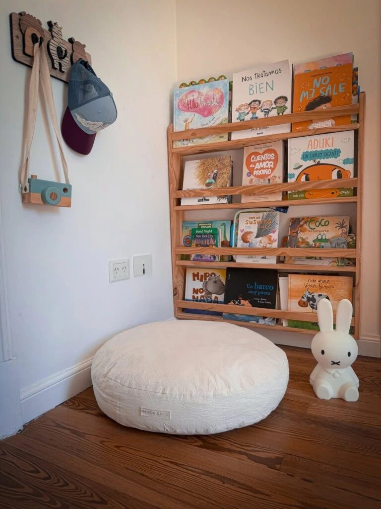 Ese guiño hogareño aparece con claridad en un rincón infantil: una biblioteca frontal de madera cargada de libros ilustrados, un almohadón XXL redondo en crudo para sentarse en el piso y una lámpara decorativa con forma de conejito blanco que suma ternura sin caer en lo estridente. En la pared, percheros con gorras y una pequeña cartera completan una escena cotidiana y funcional: estética, sí, pero también práctica.