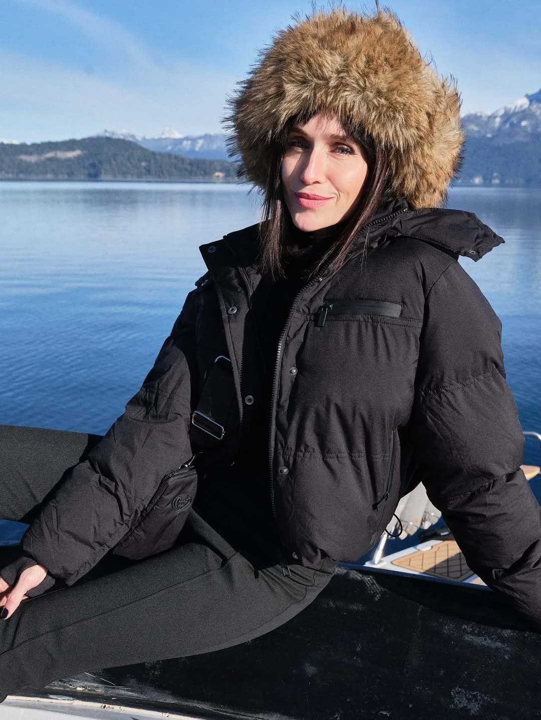 La locación elegida, un muelle con vistas panorámicas al lago y las montañas nevadas, realza el contraste entre la naturaleza inmaculada y la sofisticación monocromática del outfit. La paleta neutra y la coherencia del look refuerzan un mensaje claro: vestirse de negro sigue siendo una declaración de elegancia atemporal, incluso en un contexto de viaje.