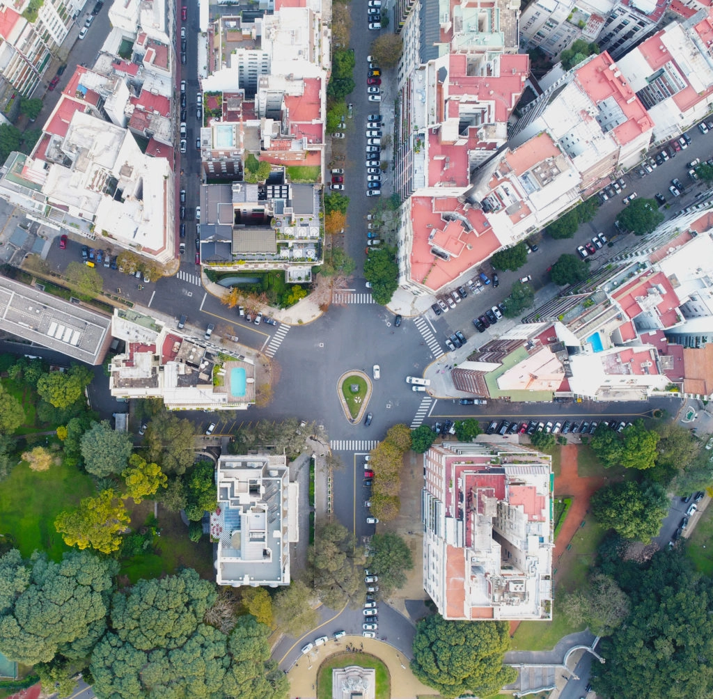 "Fui a retratar los jacarandás de la avenida Figueroa Alcorta, y sobrevolando la zona del MALBA (Museo de Arte Latinoamericano de Buenos Aires) vi que en Barrio Parque había más, así que me mandé para ahí, hasta que encontré una enorme rotonda residencial ovalada que me sorprendió".