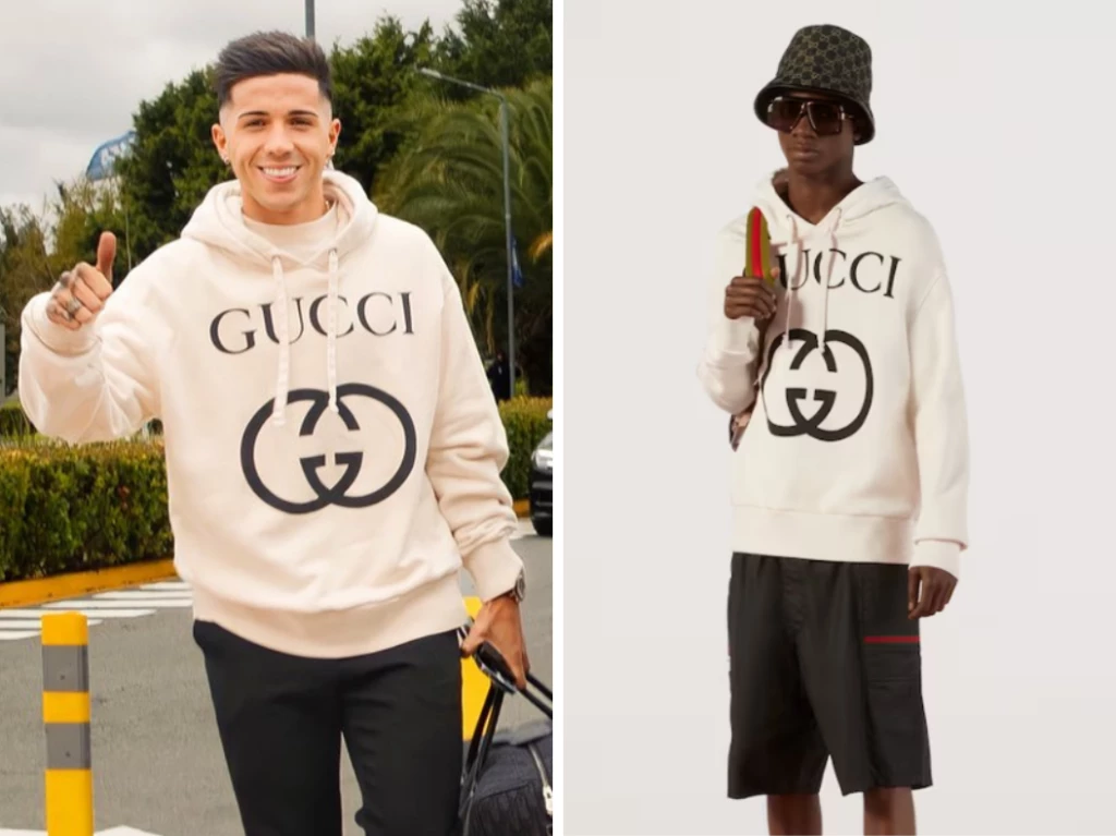 Por su parte, Enzo Fernández, quien se mostró junto a Otamendi, hizo su aparición con un buzo Gucci en color hueso. La casa de moda italiana es una de las más populares dentro del estilo de la logomanía. Sombreros, carteras, bolsos, patrones y monogramas en todo tipo de prendas. Sin dudas, una de las firmas que es exponente de esta tendencia.