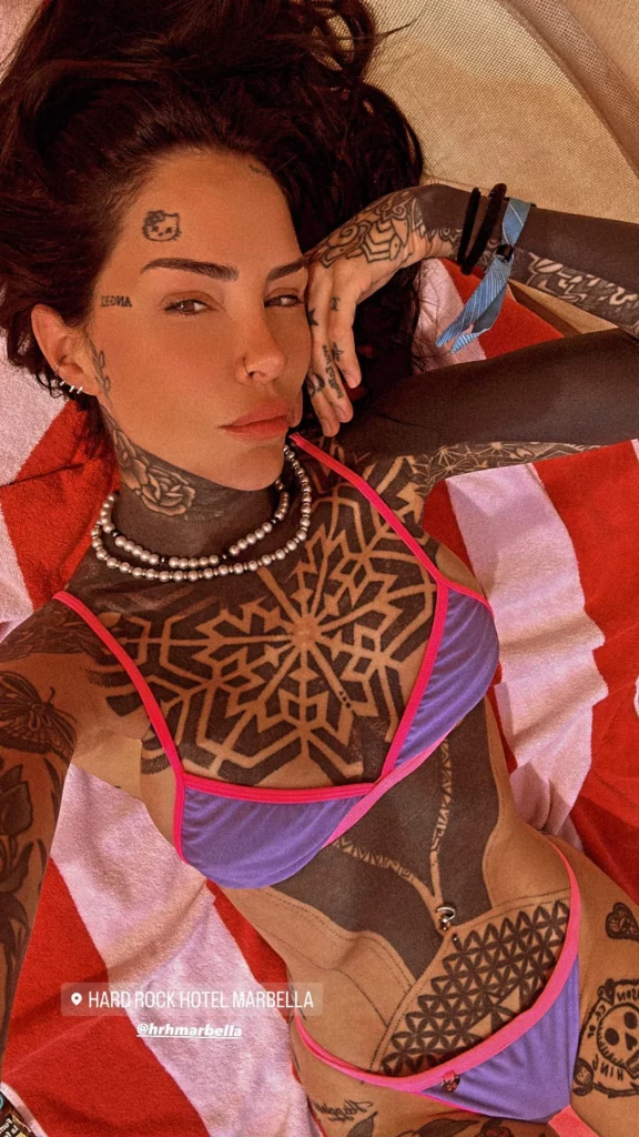Cande posó en bikini bicolor en tonos neón fucsia y violeta, dejando ver todos sus tatuajes y un piercing en su ombligo, y mostrando además, lo muy relajada que estuvo durante su viaje.