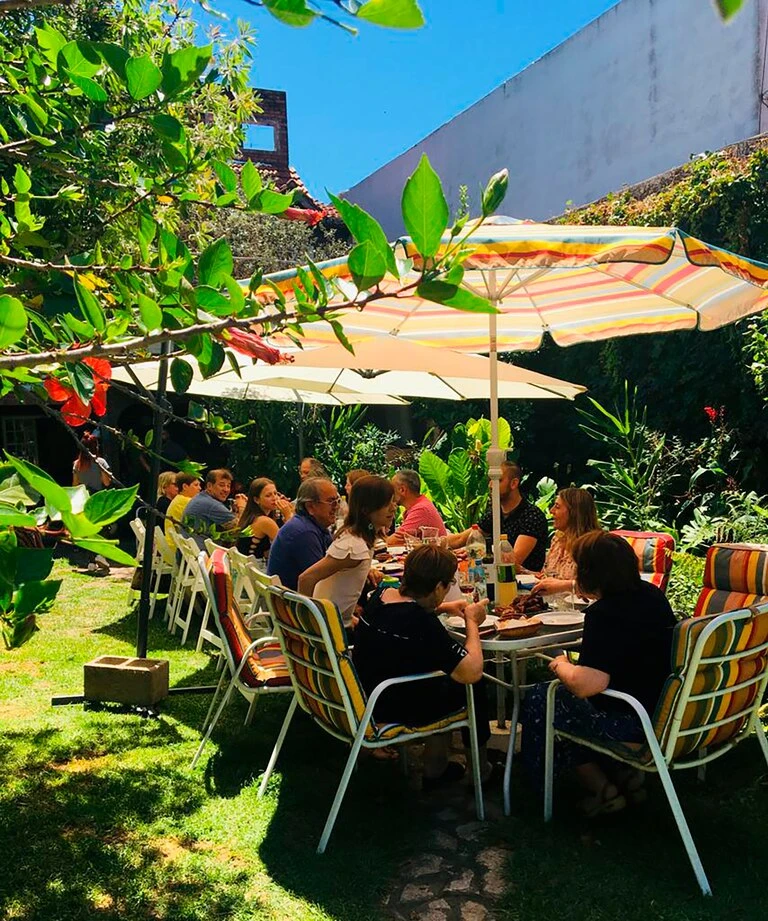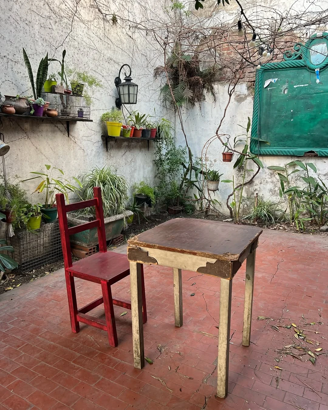 La casa tiene 110 años. Las mesas están desparramadas por el fondo, debajo de un frondoso jazmín chino y rodeadas de los jazmines y azaleas que cuidaba Mabel. Es el patio que era el patio de ella: con las plantas que ella eligió, con la pileta en el fondo, con esa mezcla de lo vivido y lo querido que ningún interiorista puede replicar.
