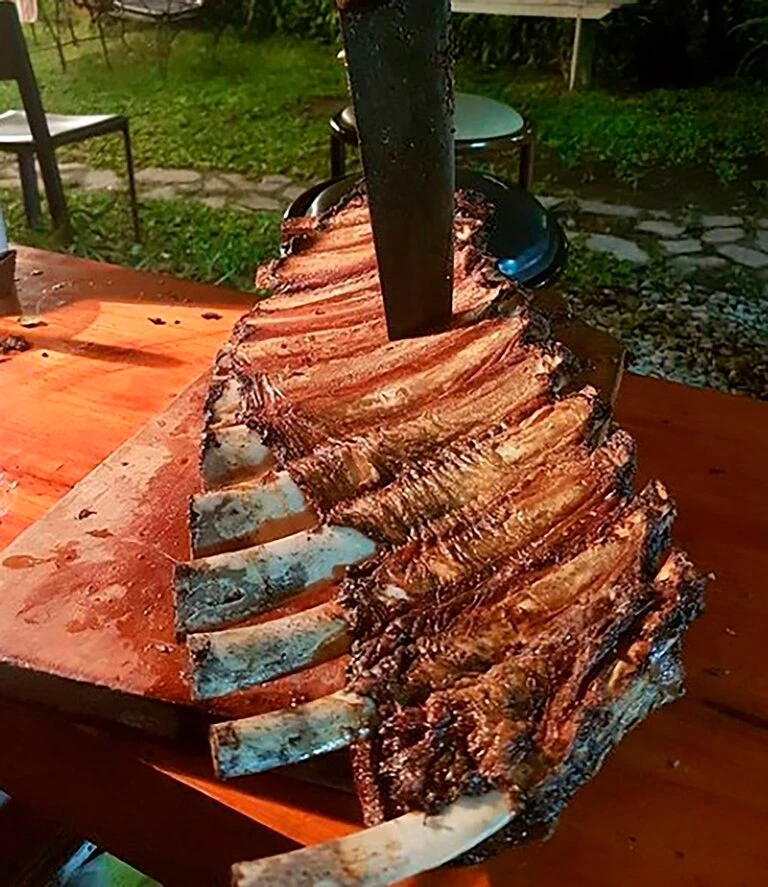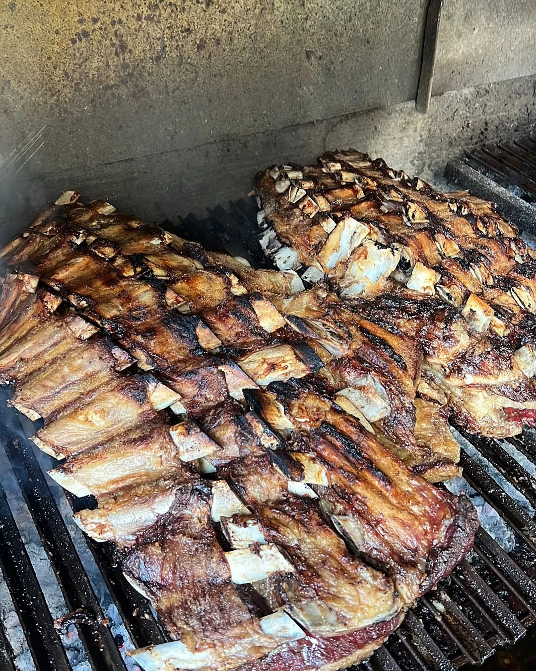 El menú arranca con las berenjenas al escabeche –receta de Mabel– y sigue con una tabla de chorizo y morcilla. Después llegan los dos protagonistas: el costillar criollo y el vacío de cocción lenta, con papas al plomo y zapallo cabutia como guarnición. El menú incluye una copa de vino o gaseosa.