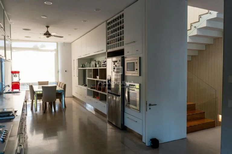 La casa cuenta con cinco dormitorios, varios de ellos en suite, y cinco baños completos, además de toilette de recepción. La suite principal, de dimensiones generosas, incluye vestidor y baño privado. La cocina, moderna y funcional, conecta con el comedor diario y con los espacios sociales, reflejando el ritmo dinámico de una familia con cinco hijos.