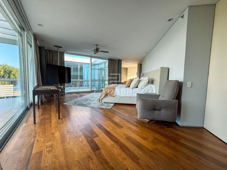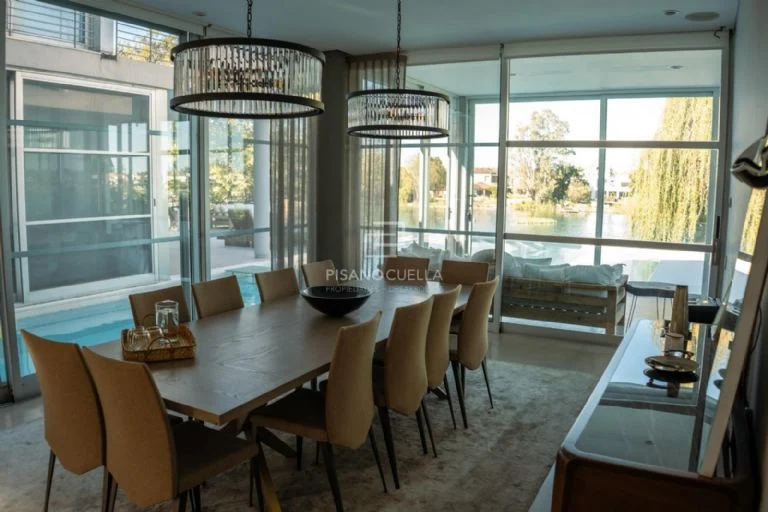 En el exterior, la galería con parrilla y sector de estar se convierte en extensión natural del living. La piscina, con vista al espejo de agua, y el solárium completan una postal típica de los countries premium de Zona Norte. También dispone de espacios de entretenimiento, como playroom y home theater, ideales para reuniones íntimas o encuentros con amigos.