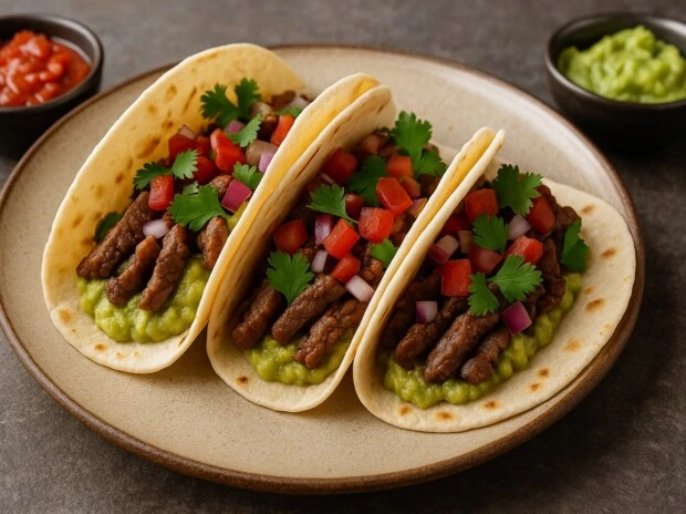 Marinar la carne con especias, ajo, jugo de limón, sal y pimienta durante al menos 20 minutos. Dorar en sartén bien caliente con un chorrito de aceite hasta que quede jugosa. Rellenar las tortillas caseras y completar con guacamole, cebolla morada y cilantro fresco.