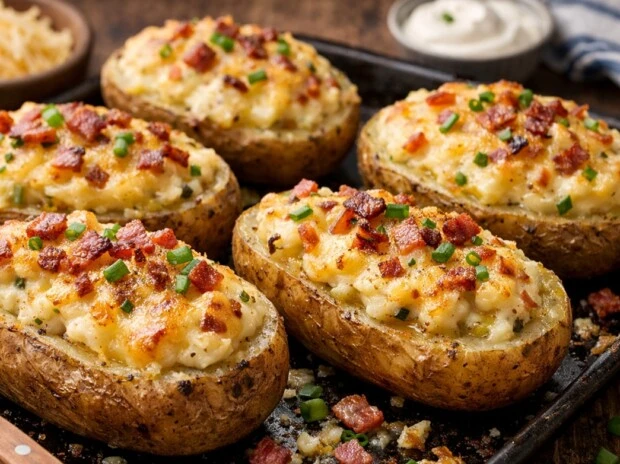 Estas papas combinan dos texturas que gustan siempre: una base suave y cremosa de papa, y un relleno más sabroso que puede sumar queso, verduras, jamón o carne. El horno hace el resto: gratina, dora y deja todo listo con aspecto de plato trabajado.
