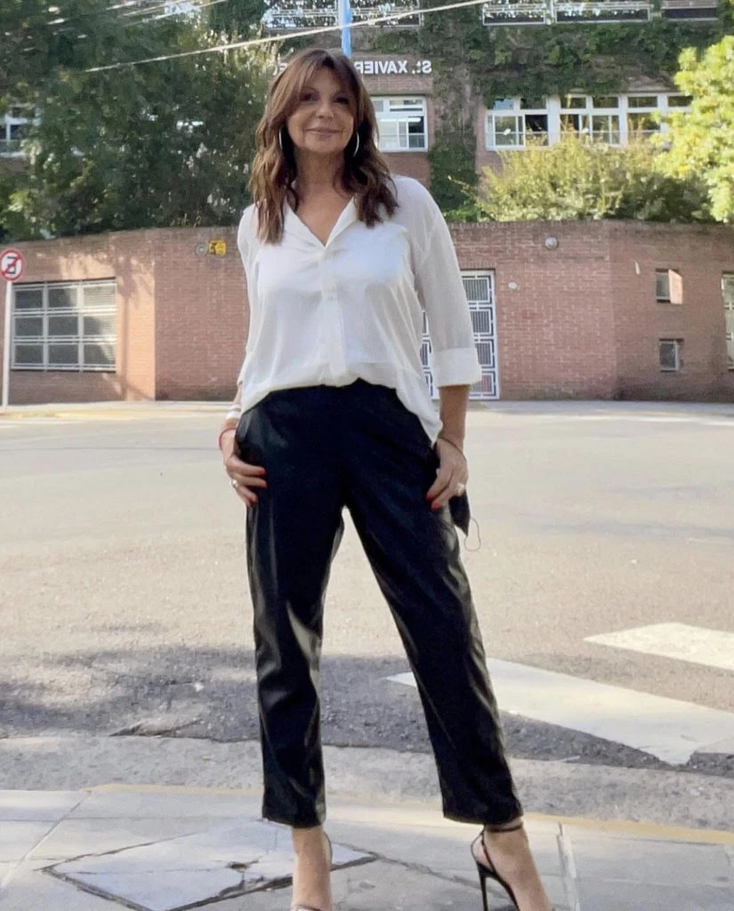 Mariel Di Lenarda, por su parte, eligió un outfil muy parecido pero, en vez de una remera, optó por una blusa blanca. Elegante y sobria, la conductora que acompaña al Pollo Alvárez todas las mañanas se caracteriza por outfits con onda pero sin estridencias.