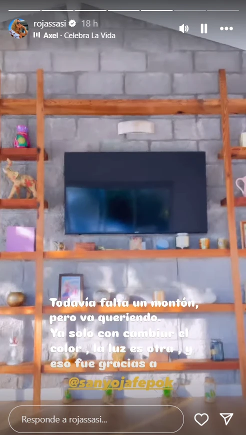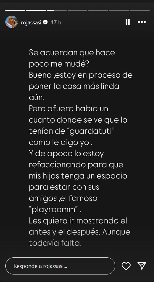 En una segunda historia, la conductora mostró cómo está quedando su nueva sala de juegos. "Todavía falta un montón pero va queriendo. Va solo con cambiar el color, la luz es otra...", indicó Rojas en ese video con un adelanto de su nuevo ambiente.