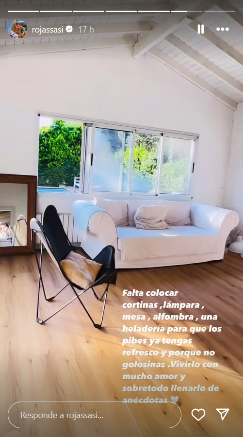 "Faltan colocar cortinas, lámpara, mesa, alfombra, una heladera para que los pibes ya tengan refresco ¿y por qué no golosinas? Vivirlo con mucho amor y sobre todo llenarlo de anécdotas", añadió la actriz en otra historia que subió a sus redes.
