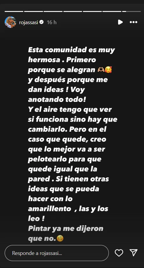Por último, Rojas indicó: "Esta comunidad es muy hermosa. Primero porque se alegran y después porque me dan ideas. ¡Voy anotando todo! Y el aire tengo que ver si funciona si no hay que cambiarlo. Pero en el caso que quede, creo que lo mejor va a ser plotearlo para que quede igual que la pared. Si tienen otras ideas que se pueda hacer con lo amarillento las y los leo. Pintar ya me dijeron que no".