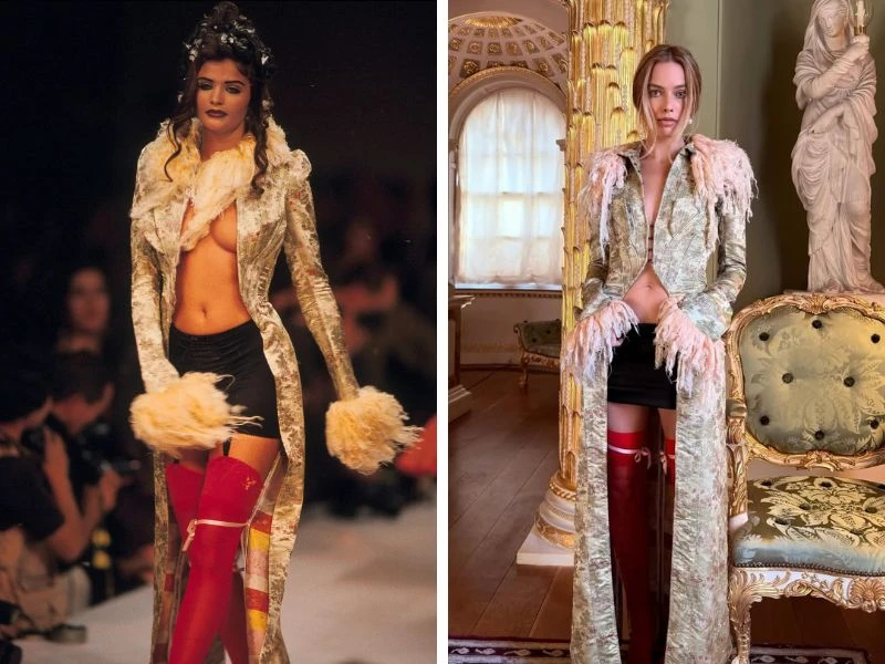 Desde el universo del cine, Margot Robbie también apostó por el archivo durante la gira de prensa de “Cumbres borrascosas”. En Londres, la actriz apareció con un look completo de John Galliano de la colección primavera–verano de 1992, compuesto por un abrigo de aire decadente con ribetes de piel, minifalda negra y medias rojas. La elección no solo captó la atención de críticos y fashionistas, sino que volvió a poner en valor la impronta teatral y romántica del diseñador en sus primeros años.