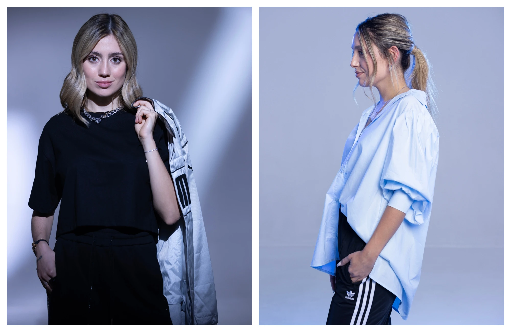 "En el primer look, Sofi Martínez interpreta lo deportivo desde un lugar inesperado -observa Jazmín Ochoa-. Combina una camisa celeste oversize que nos remite a lo formal y estructurado, con un pantalón deportivo que nos lleva a un universo mas urbano y funcional. En el contraste entre texturas erupciona una idea contemporánea y fluida que nos transporta a una mujer sofisticada pero sin esfuerzo, simple pero poderosa. Como embajadora de Adidas, logra interpretar la estética de la marca, combinando el mundo deportivo con una mirada editorial", redondea.