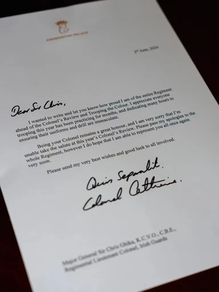 A pocos días de cumplirse 3 meses de que anunciara al mundo entero que había sido diagnosticada de cáncer, Kate Middleton hizo una pequeña reaparición en el ensayo general del desfile militar Trooping the Colour. Esto se dio mediante una conmovedora carta que leyó la Guardia Inglesa en pleno evento.
