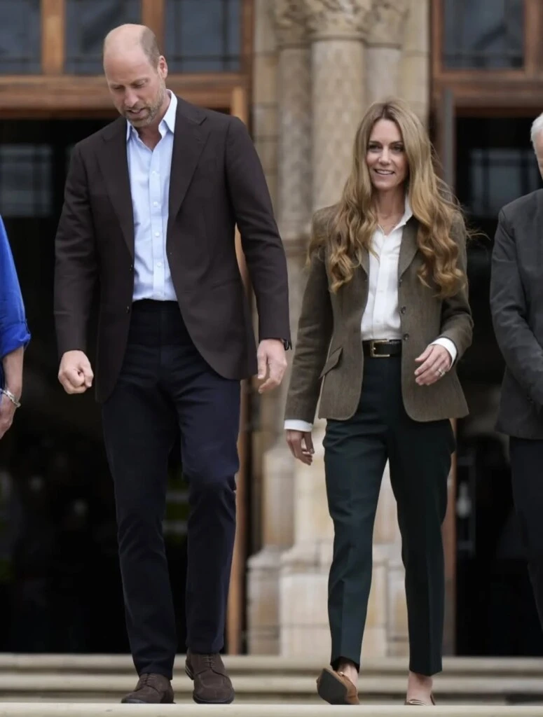 La princesa de Gales eligió piezas sencillas que cualquiera podría tener en el armario y ha formado un look de lo más acertado para la ocasión. Como parte superior optó por una camisa blanca básica que combinó con una 'blazer' de 'tweed' de corte entallado. Y para la parte inferior se decantó por un pantalón oscuro de corte recto que remató con un cinturón de hebilla cuadrada.