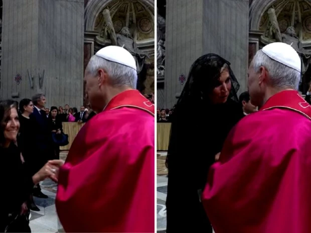 Por lo que se pudo ver en la transmisión de Vatican Media, Zorreguieta lució un vestido largo, que cubre completamente los brazos y las piernas. Además, tiene una mantilla negra, con encaje, cubriendo su cabeza, un bolso negro y unos anillos de plata.