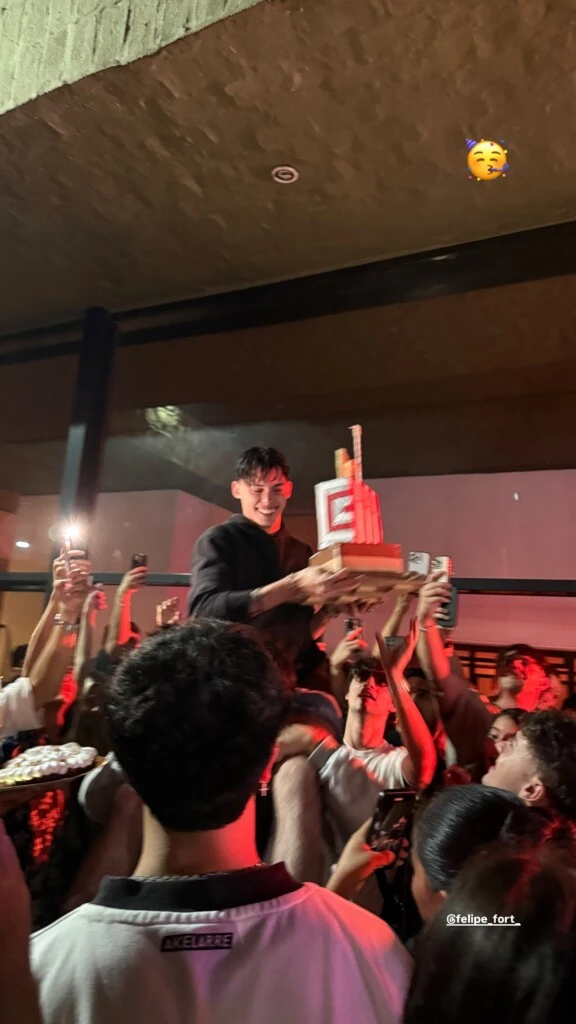 Por su parte, Felipe subió a sus historias de Instagram una divertida imagen en la que se lo ve rodeado de muchos amigos con una significativa torta de cumpleaños con un chocolate gigante muy conocido de su marca.