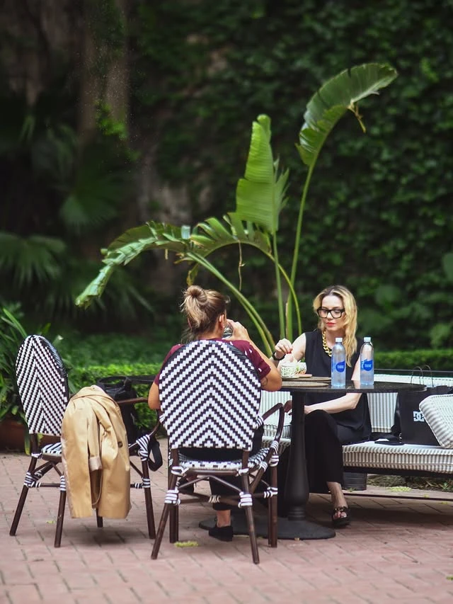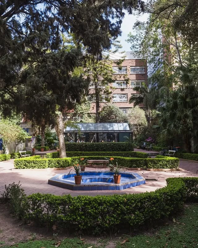 El espacio exterior tiene dos niveles. El nivel inferior, más íntimo, está flanqueado por columnas de madera pintada y tiene sus fuentes con cerámicas de Talavera. El superior, más abierto, da al jardín con los árboles centenarios. En primavera y otoño, las flores que crecen en los canteros entre las mesas hacen del lugar algo que no encaja del todo con ninguna categoría conocida. No es un café de barrio, no es un restaurante de chef, no es un jardín botánico: es las tres cosas al mismo tiempo.