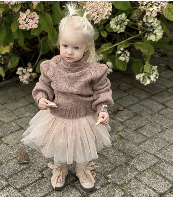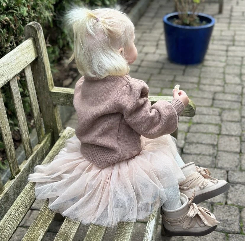 Daniela Christiansson compartió fotos adorables de su hija, la pequeña Elle. Sueter con ochos, falda tutú -de tul-medias de lanas y botas con moño: un look bailarina chic divino.