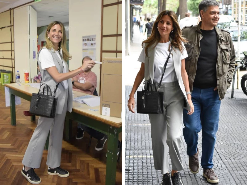 Otra de las figuras que supo marcar tendencia con su estilo fue María Belén Ludueña, lesposadel candidato a jefe de Gobierno de la Ciudad de Buenos Aires, Jorge Macri. La periodista lució una remera blanca básica, a la que sumó un chaleco gris ceñido al cuerpo y un pantalón sastrero en combinación. Sin embargo el accesorio que se llevó todas sus miradas fue una bonita cartera simil cuero de color negro.