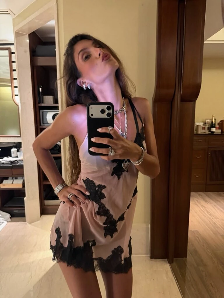 El mayor logro de este estilo es cuando deja de ser exclusivamente nocturno. En uno de los looks de Lola, se aprecia un mini vestido lencero nude con aplicaciones de encaje negro, sumando múltiples collares y una actitud completamente descontracturada frente al espejo.
