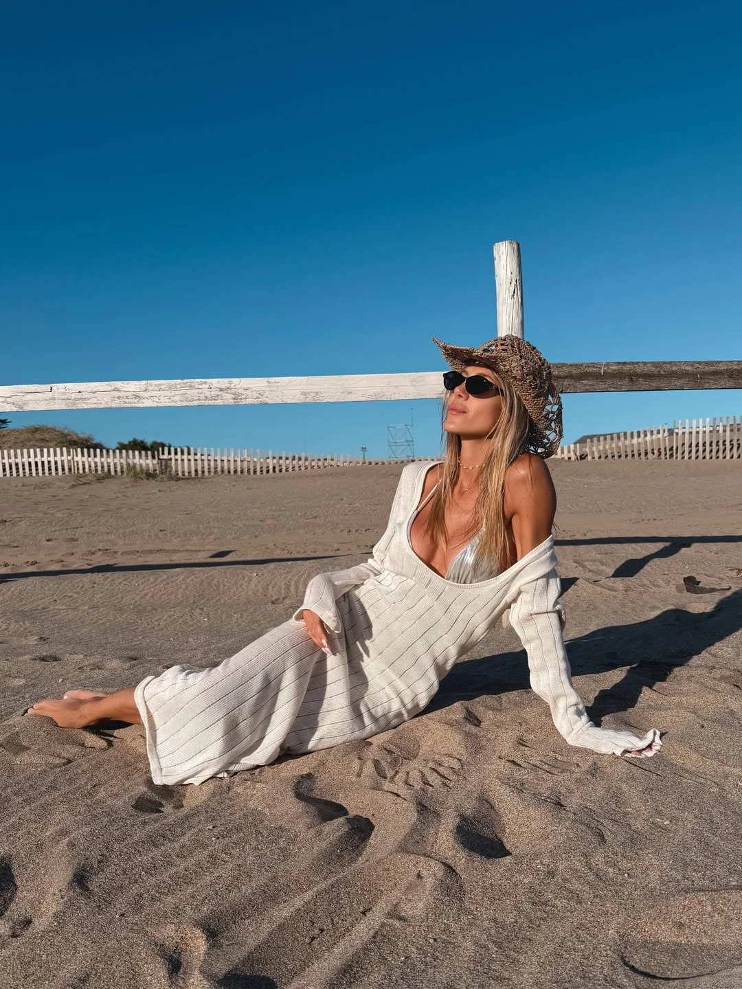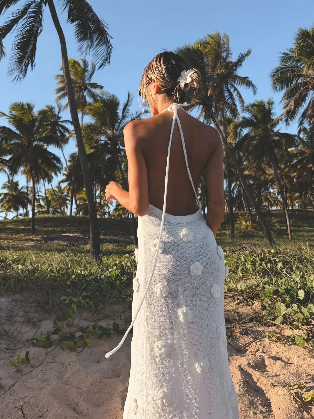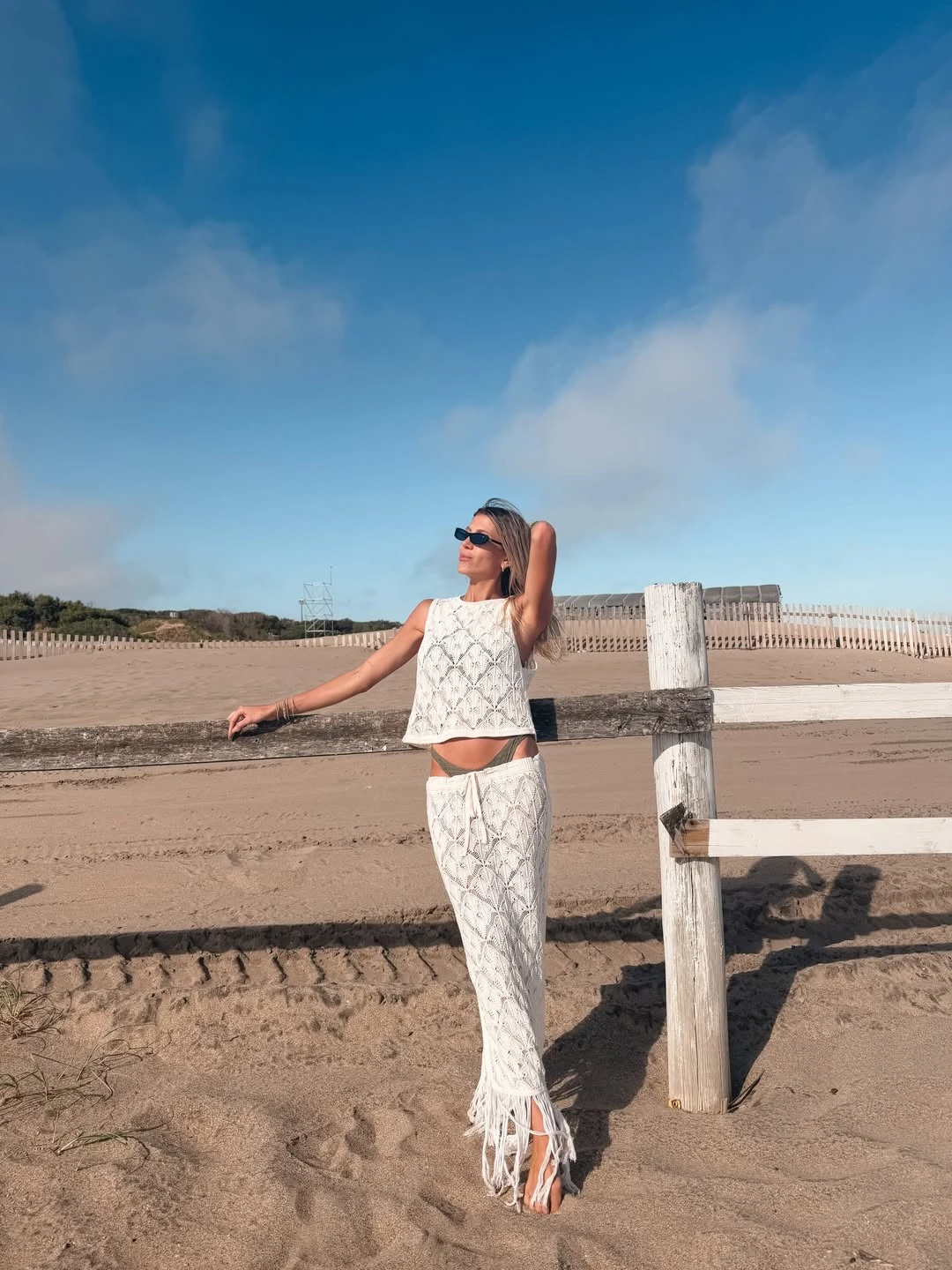 Entre las constantes de su vestuario aparece una paleta clara y natural, con el blanco y los tonos arena como protagonistas. En uno de los posteos, Ruggeri luce un vestido tejido color marfil, de espalda descubierta y silueta relajada, intervenido con pequeños apliques florales, que refuerza la impronta romántica que atraviesa toda su guía de estilo veraniego.