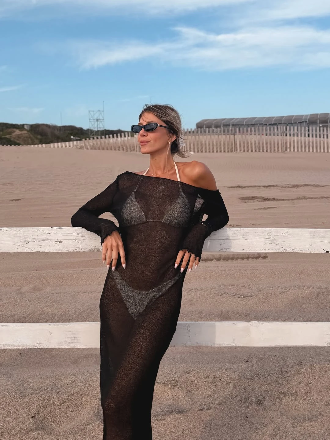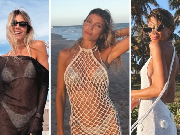 Las transparencias, justamente, se consolidan como uno de los ejes de su guardarropa playero. La modelo también se suma a esta estética con un vestido negro translúcido, de escote off shoulder y mangas largas, llevado sobre traje de baño, en sintonía con referentes como Pampita o Zaira Nara, que vienen marcando este camino en la moda de playa.
