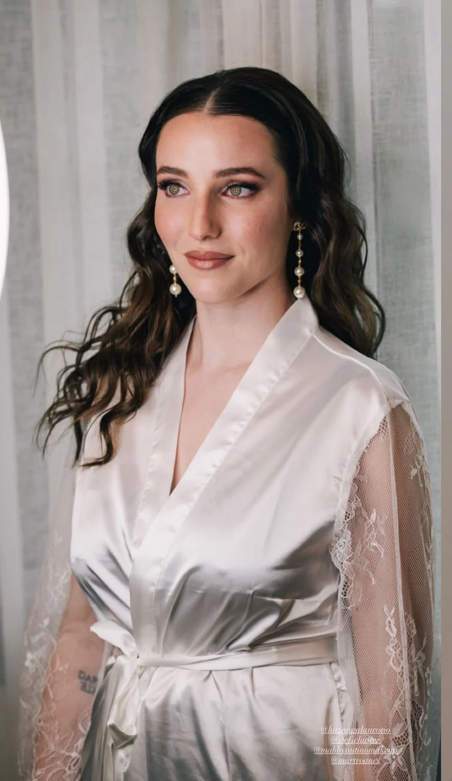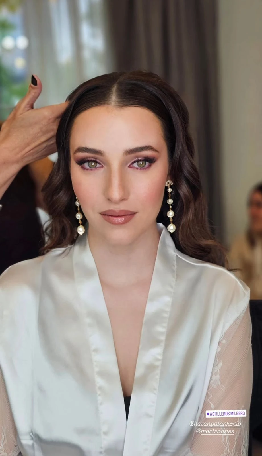 En cuanto al cabello, llevó un peinado suelto con ondas amplias y marcadas, con raya al medio. El estilo, clásico pero relajado, acompañó la caída del vestido y enmarcó su rostro de forma armónica. Como único accesorio, eligió aros largos con perlas, un detalle delicado que aportó brillo sin sobrecargar.