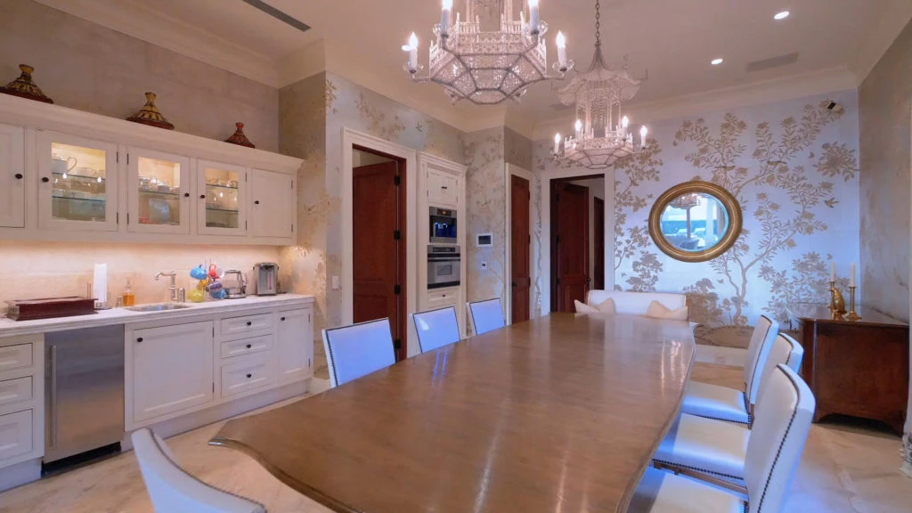 Cuenta con un gran living, un comedor formal, una enorme cocina gourmet de estilo industrial, biblioteca, cava de vinos, un enorme cuarto que da a la pileta y hasta un ascensor.