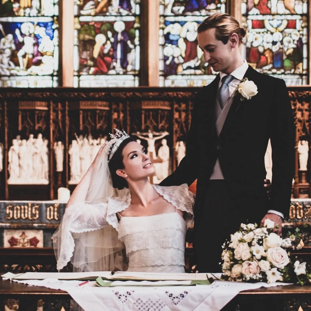 Respecto a su look, la novia lució un elegante vestido de encaje escalonado con mangas acampanadas, y la Brocket Tiara, una joya familiar de diamantes que también usaron su tía y su abuela el día de sus bodas.