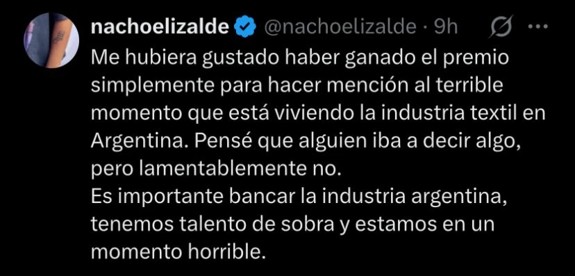“Me hubiera gustado haber ganado el premio simplemente para hacer mención al terrible momento que está viviendo la industria textil en Argentina. Pensé que alguien iba a decir algo, pero lamentablemente no”, escribió en su cuenta de X.