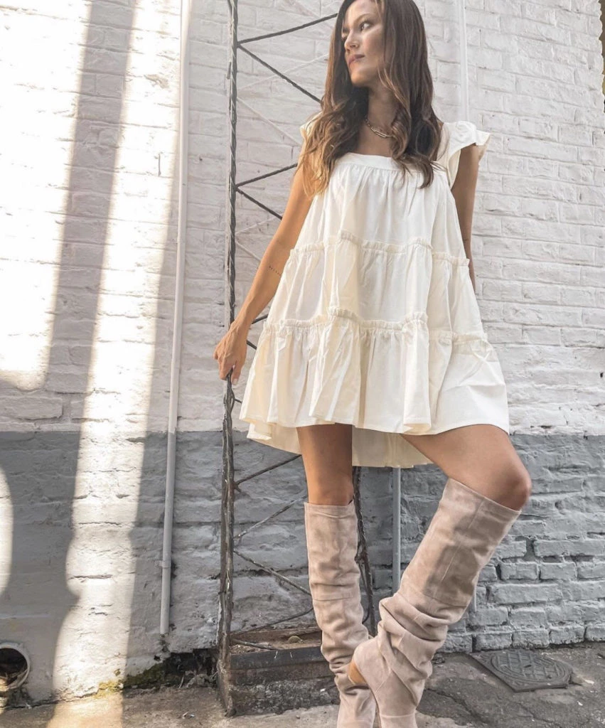 Hay varias opciones para usarlas, podés combinarlas con shorts, vestidos cortos o una falda pero algo clave es que se vea un poco de piel entre la prenda y las botas. Este truco es ideal para que visualmente tu pierna se vea más larga.
