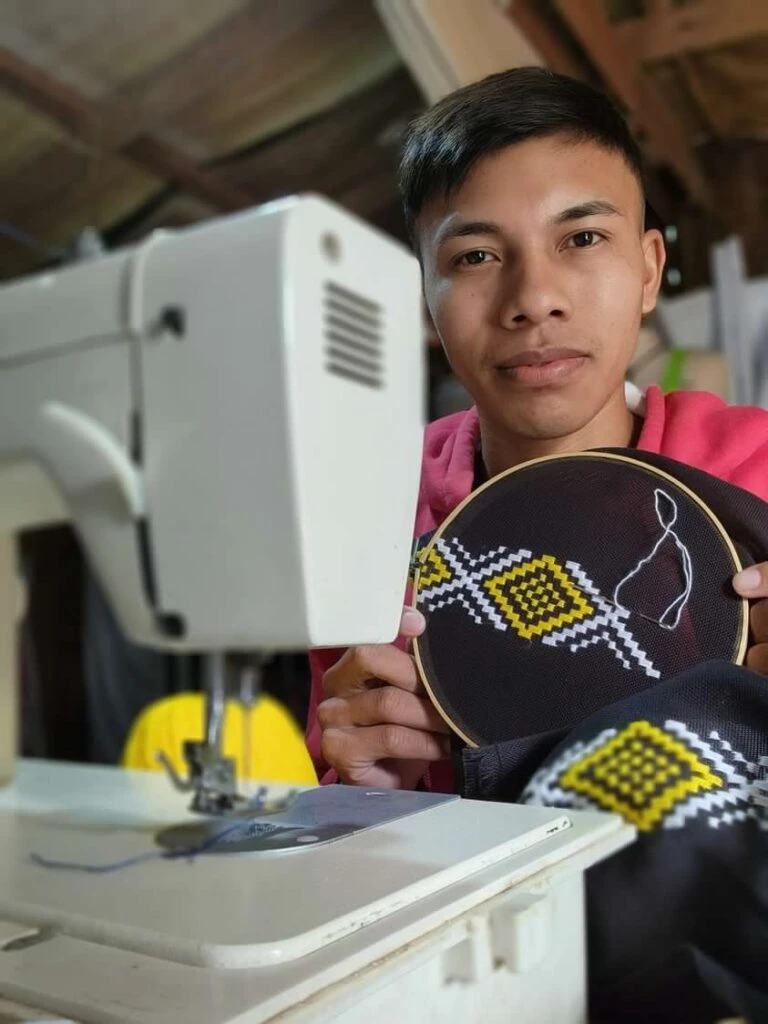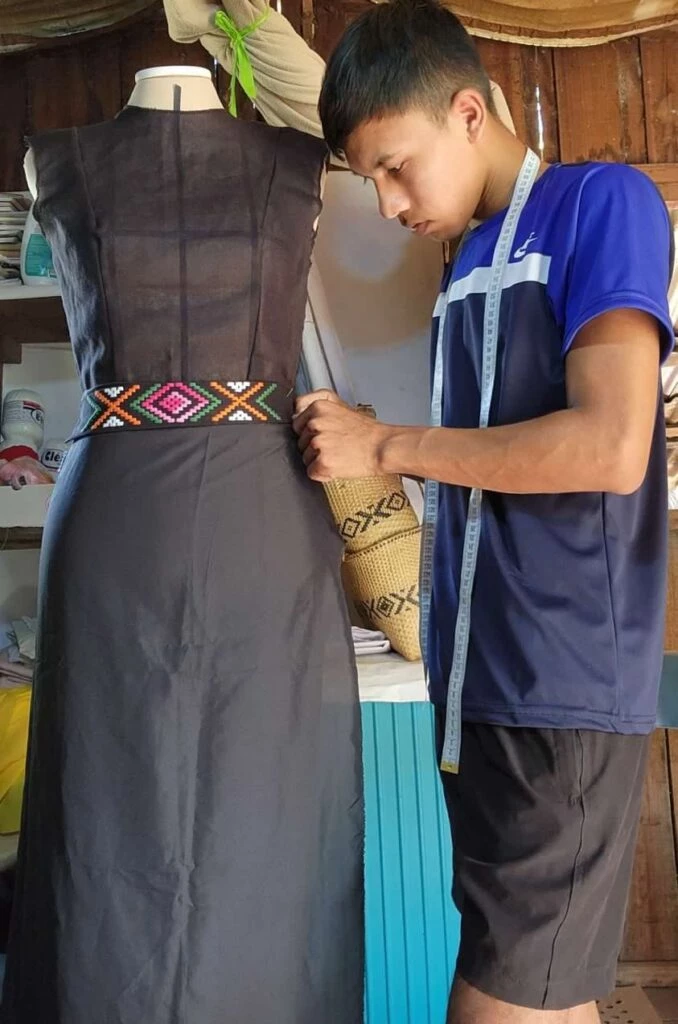 “Aprendí a hacer bordados a los 13 años, inspirándome en símbolos indígenas -continúa-. Claro, los integrantes de las etnias de la zona pintan sus rostros como forma de proyectar su identidad”, explica su inspiración el artista, cuyos diseños no se limitan a la confección de ropa, sino que además incorpora historias y símbolos que reflejan esa herencia cultural.