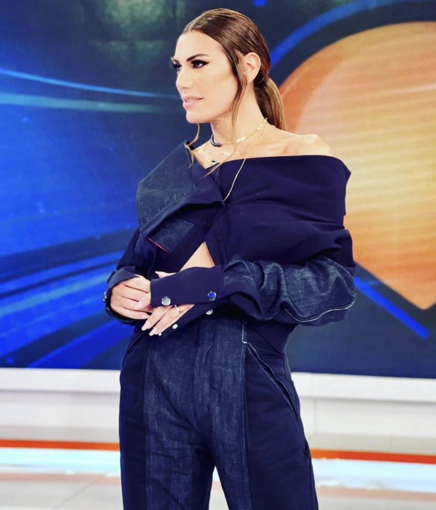 La conductora de Intrusos eligió un look muy canchero y que es tendencia: el nuevo traje. Confeccionado en denim, con pantalón cintura alta y un saco con cuello irregular, que deja los hombros al descubierto. Se trata de una pieza tan original como sofisticada.