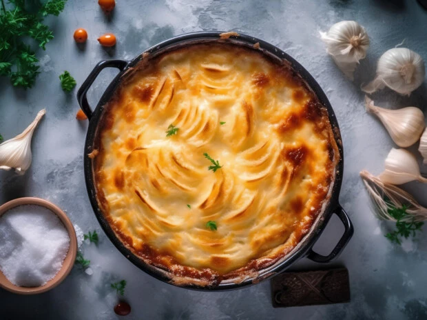 Hervir las papas, hacer un puré, freír la cebolla y la carne, mezclar todos los ingredientes y hornear finalmente en una fuente de barro. Se recomienda el uso de un cucharón de madera para mezclar el puré y lograr una textura firme pero no dura. El proceso culmina con la cocción al horno durante 5-10 minutos.