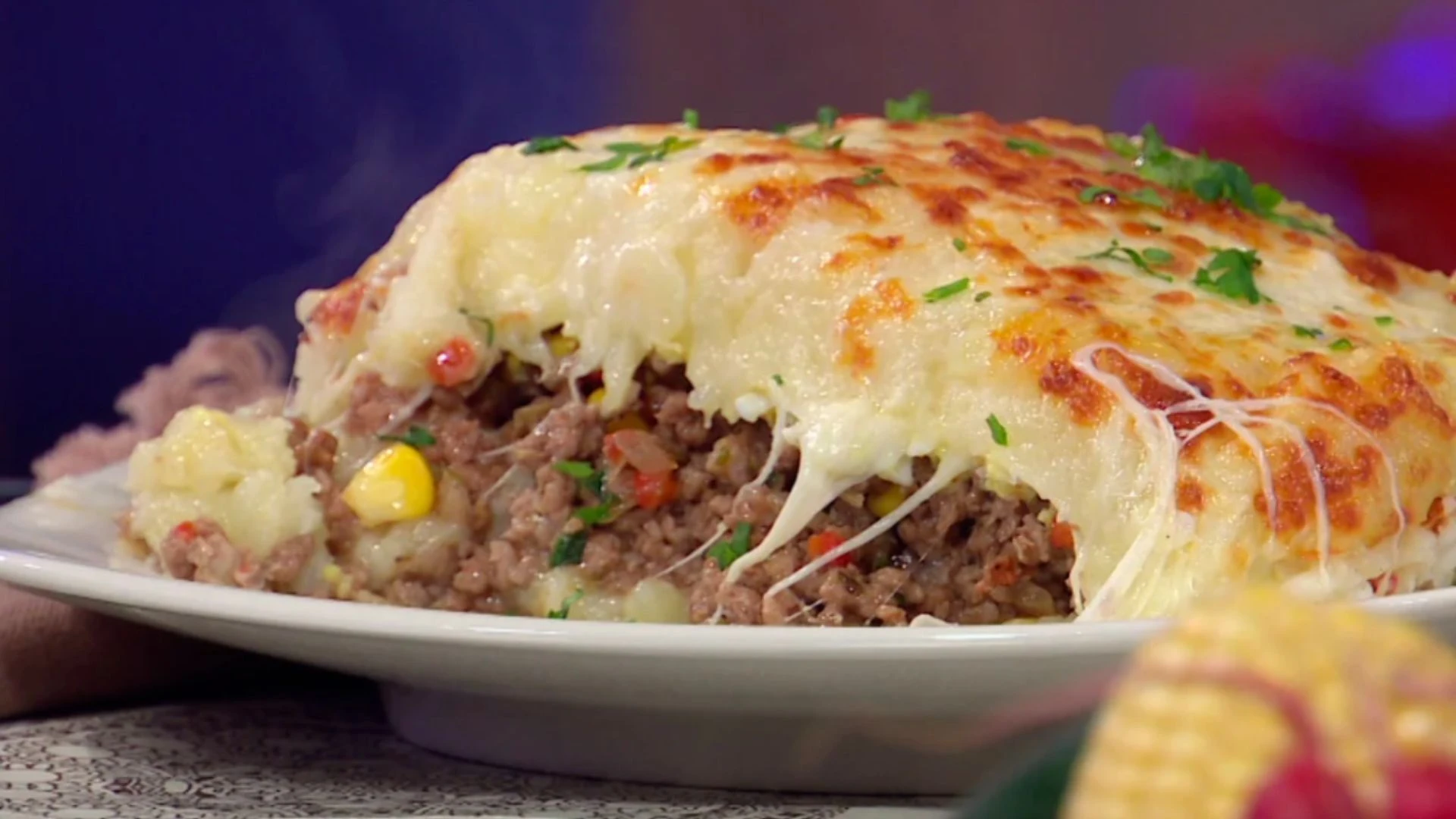 7. Colocar el picadillo de carne en una fuente de barro, espolvorear con el huevo picado, cubrir con el puré de papa y dorar en horno muy caliente durante 5-10 minutos. Servir.