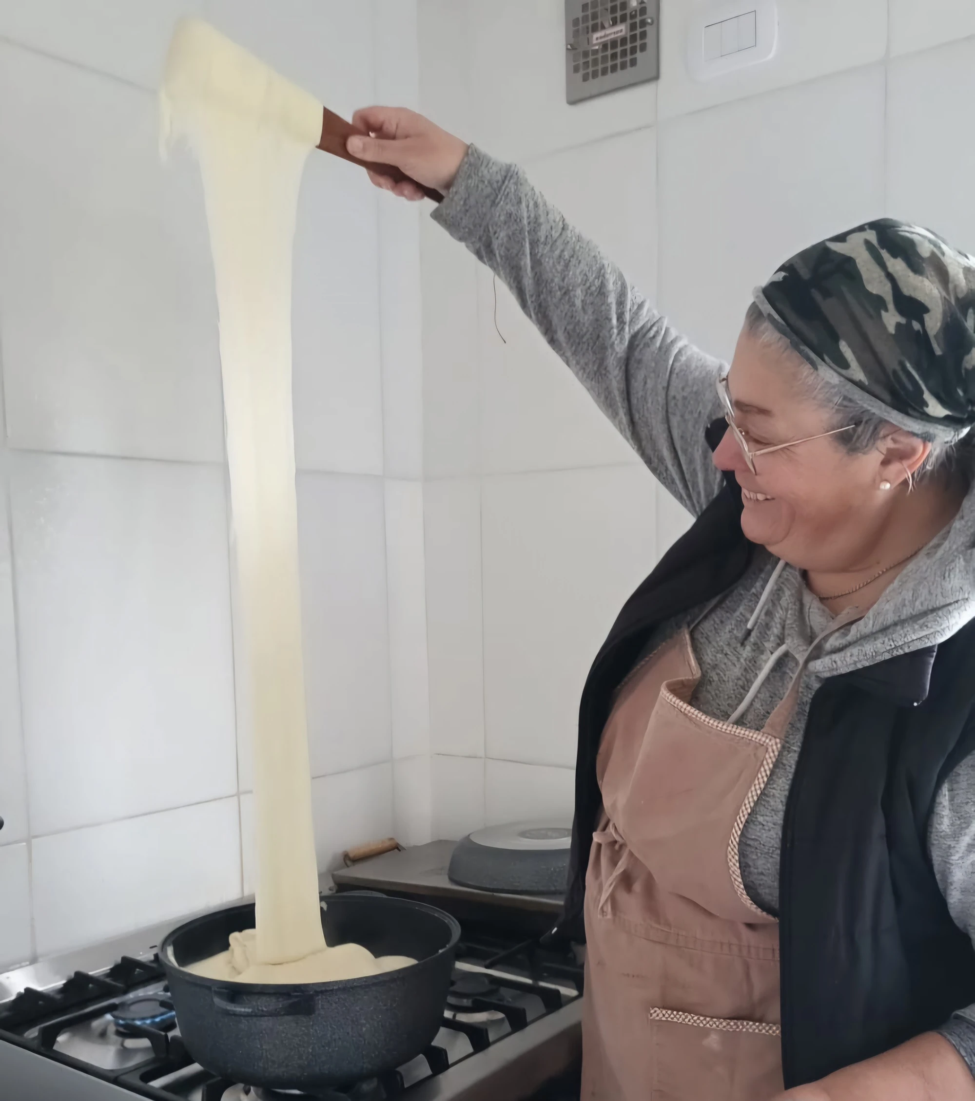 Esta comida tiene una característica, un sello muy personal, que es el gesto de “hilar” que genera el queso. Con un gran cucharón se estira lo más posible, mostrando cuan alto puede llegar, y ese es el momento de servir.