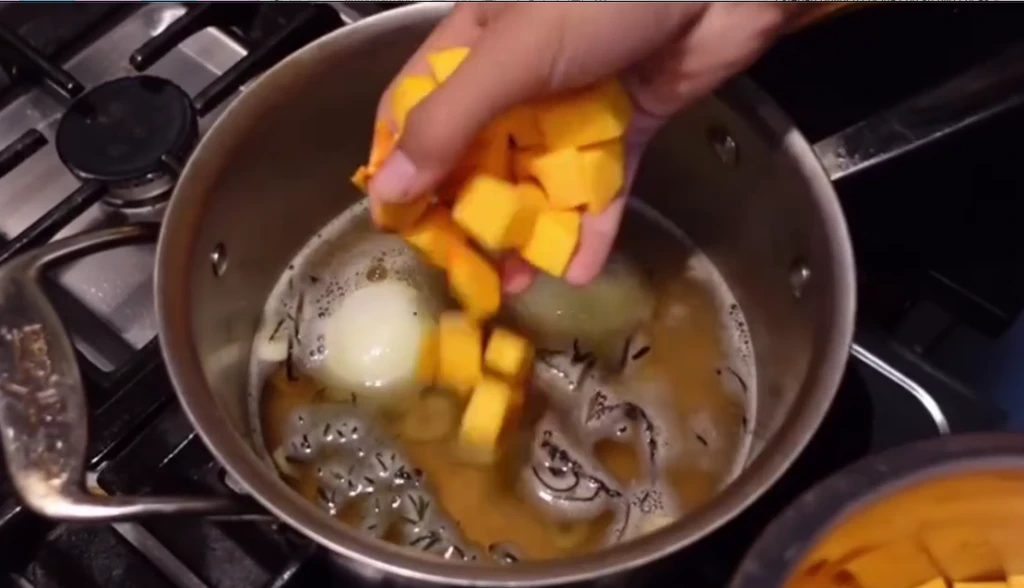 Se lleva hacia el arroz el zapallo preparado con el caldo.