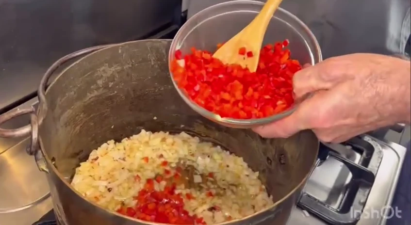 "Una vez listo el mondongo, rehogamos cebolla, morrón y ajo en aceite. Y, cuando se empiezan a poner blandas estas verduras, agregamos puré de tomate, una cucharada chica de azúcar, el mondongo hervido, el chorizo cortado en rodajas y la panceta cortada en fetas pequeñas", va describiendo Esteban.