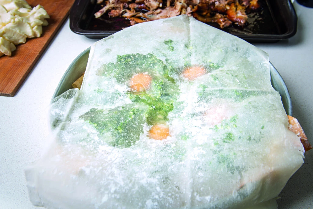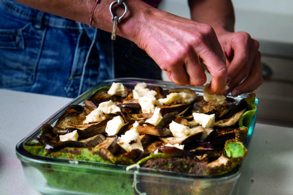 "Por otro lado, está la masa: para este tamaño de fuente que tengo, que es de 28 centímetros, usé dos pliegos de masa filo y los fui doblando, y entre cada capa puse aceite de oliva", comenta mirando los ingredientes dispuestos en su mesada. "Eso sí, antes de colocar la última capa hice cuatro huecos en el relleno y agregué cuatro huevos, que quedaron súper lindos", acota.