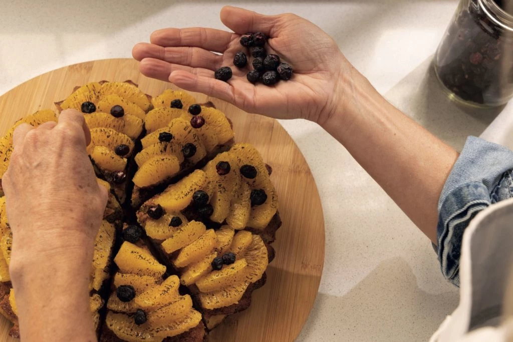 Colocamos en un molde previamente enmantecado y enharinado con papel de cocina en la base y cocinamos la mezcla hasta dorar la superficie con el horno a 180 grados por unos 35/40 min aproximadamente (Un tip: podés pinchar el budín y si el utensilio sale sin mezcla significa que ya está listo). Terminar con gajos de naranja a vivo frescos o quemados con soplete, y arándanos.