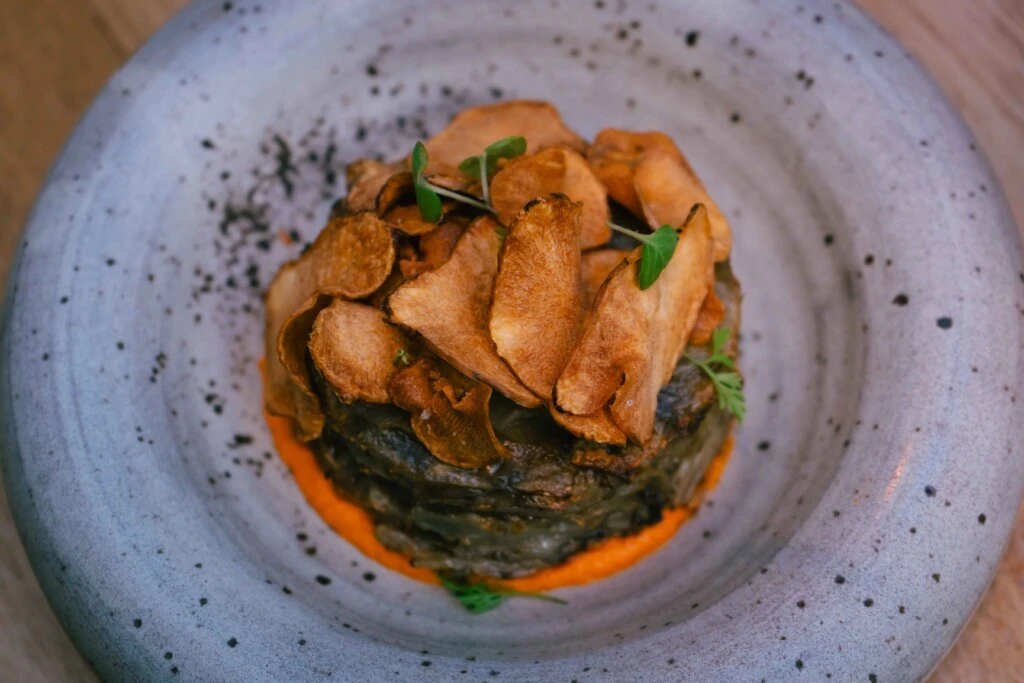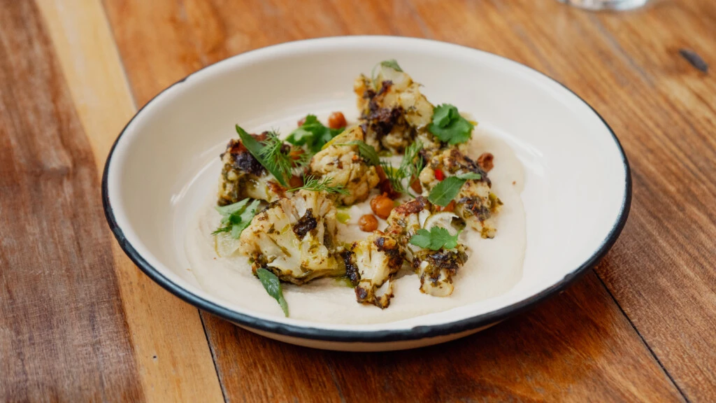 - Plato vegano y apto para celíacos: coliflor marinado en chimichurri casero de la casa y leche de coco sobre una base de hummus de almendras, garbanzos fritos y pickles de lima.