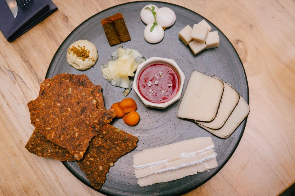 - Plato de quesos de Sacro: queso de kimchi, boconcinos de avellanas y queso Camembert.