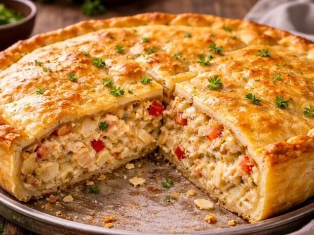 Esta versión de tarta de pollo cremosa es fácil de preparar, económica y muy rendidora. Con pocos ingredientes y un procedimiento sencillo, se obtiene una preparación casera que puede hacerse con anticipación y recalentar sin perder textura ni sabor.