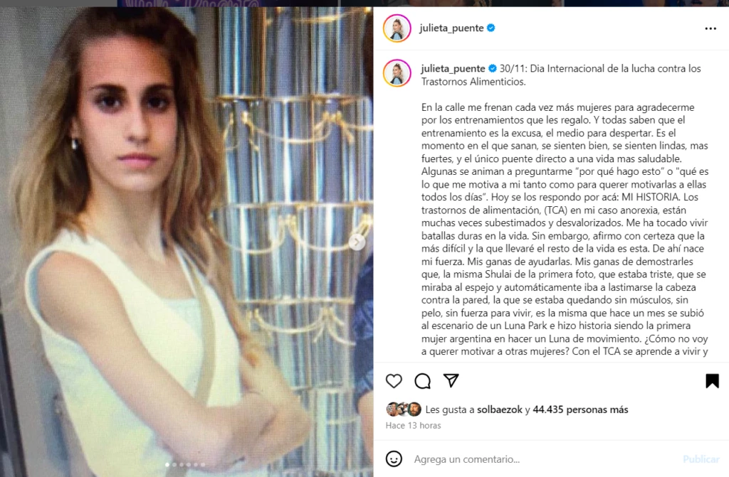 "La misma Shulai de la primera foto, que estaba triste, que se miraba al espejo y automáticamente iba a lastimarse la cabeza contra la pared, la que se estaba quedando sin músculos, sin pelo, sin fuerza para vivir, es la misma que hace un mes se subió al escenario de un Luna Park e hizo historia siendo la primera mujer argentina en hacer un Luna de movimiento", escribió junto a una imagen en la que se la ve notablemente delgada y con un aspecto poco saludable.
