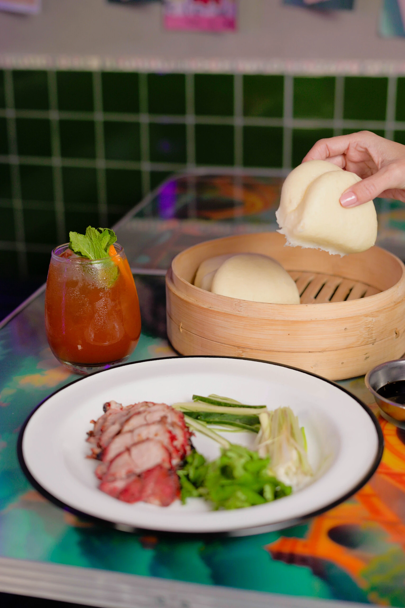 La propuesta gastronómica recorre sabores de Japón, China, Vietnam, Tailandia y Corea, con platos inspirados en la cocina callejera asiática. Entre las opciones se destacan los dumplings de langostino y ternera, las gyozas de cerdo, los nems song vietnamitas, langostinos crujientes y el bao de panceta (también en versión veggie). Entre los principales, sobresalen el Pad Thai con langostinos, el Bo Xao de udon con bondiola marinada y el Pancho Teri, un pan bao con teriyaki, kimchi y maní japonés. Para el cierre dulce, brillan el Taiyaki relleno de helado con caramelo de miso y el Kuro Roll de cacao negro con mousse de dulce de leche.