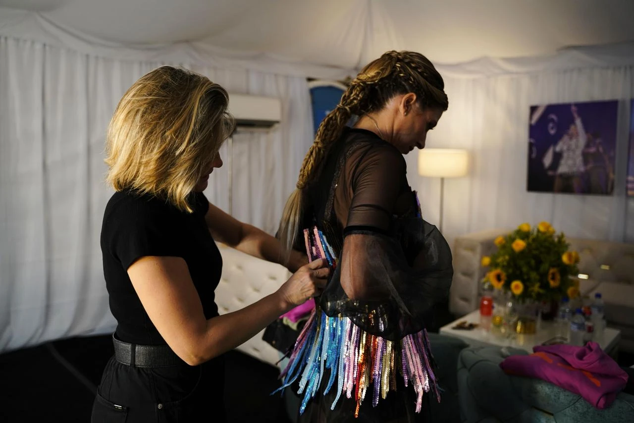 "Cuando nos dimos cuenta que este era el cambio más rápido y el más complejo, porque los flecos se nos enredaban por todos lado, tuvimos que empezar a depilar el vestuario por detrás para que no se nos enredaran en el cierre", revela la vestuarista sobre uno de los looks más esperadas por los fans.