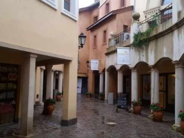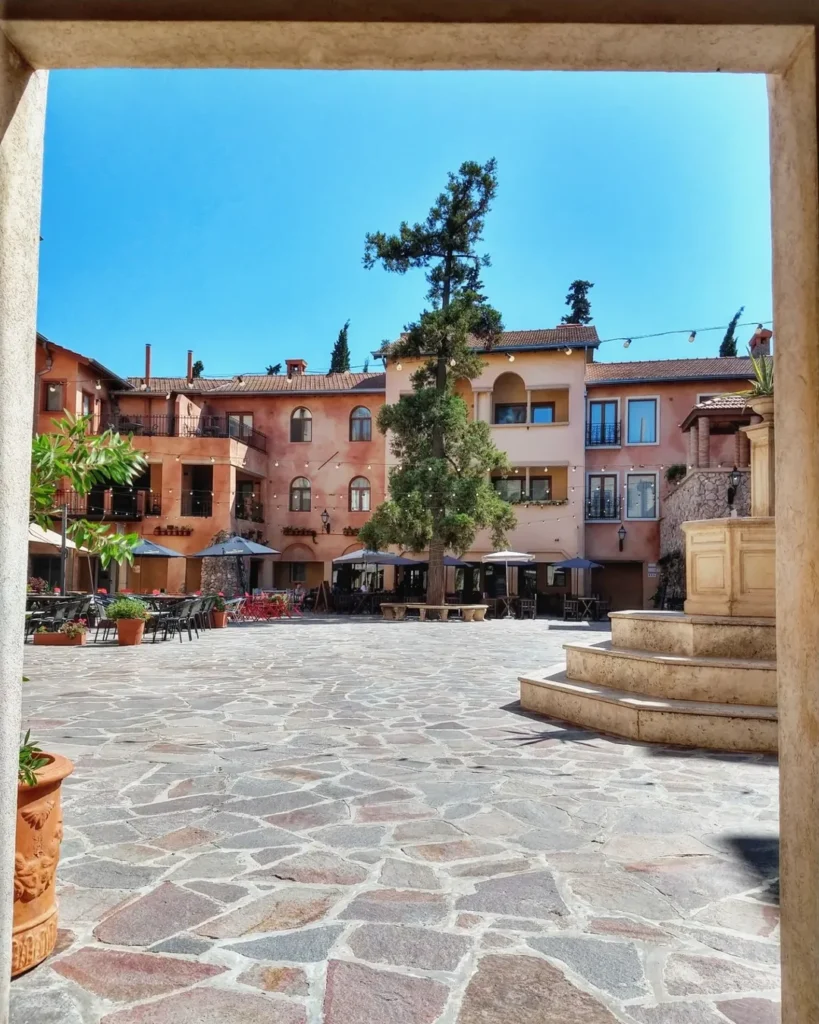 Los responsables de esta atmósfera son la arquitectura y el diseño urbano pensado para evocar a la Toscana: muros de ladrillo y revoques, arcos bajos, faroles con aire antiguo y vegetación cuidada que suaviza el paisaje.