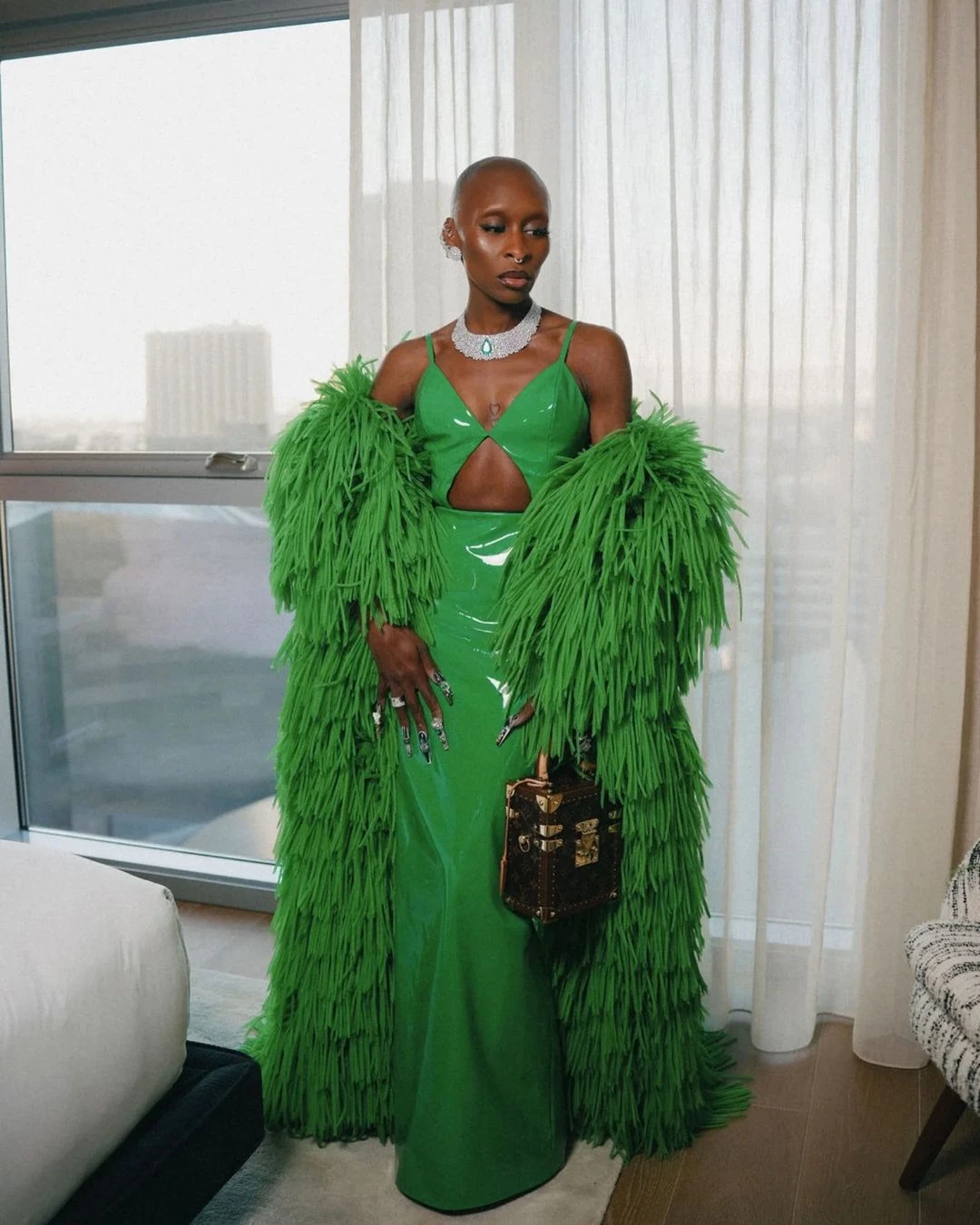 Cynthia Erivo fue otra cantante que lució un elegante vestido verde de Louis Vuitton con aberturas en la parte delantera y los laterales, que combinó con un chal con flecos hasta el suelo, que agregó mayor dramatismo y presencia en el estilismo, para desfilar en la red carpet de la premiere del fim que protagoniza junto a Ariana Grande, Wicked.