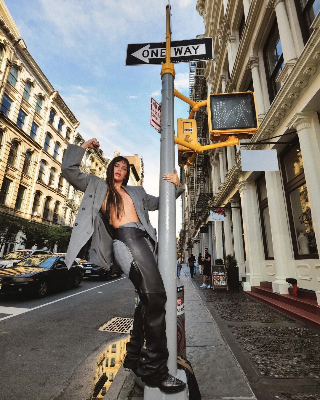 En tanto, la artista argentina recorrió las calles de Nueva York, Estados Unidos con saco XL a rayas, con el torso al descubierto, que combinó con unos modernos pantalones que combinaba géneros: cuero y la misma tela del saco.